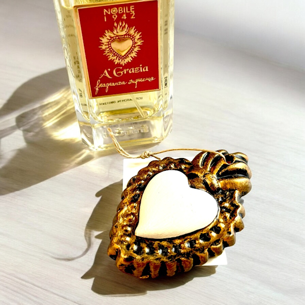 ちなみに、このI Rituali(儀式)シリーズの香水には手作りのモチーフがついているのだが、このA'Graziaについてきたモチーフはナポリの街のあちこちで見られるというハート型のチャームです。なんと手作りのチャームなのだそうで、これもまたお守りとして香水と一緒に大事にしまっておきたい。